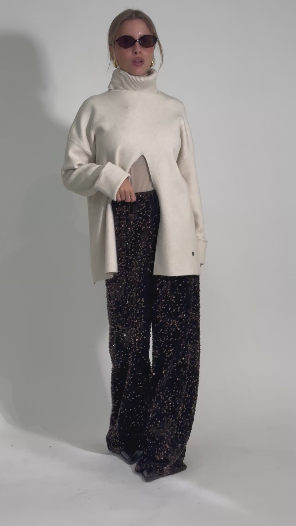 Pantalone a palazzo in velluto foderato con paillettes e vita elastica.