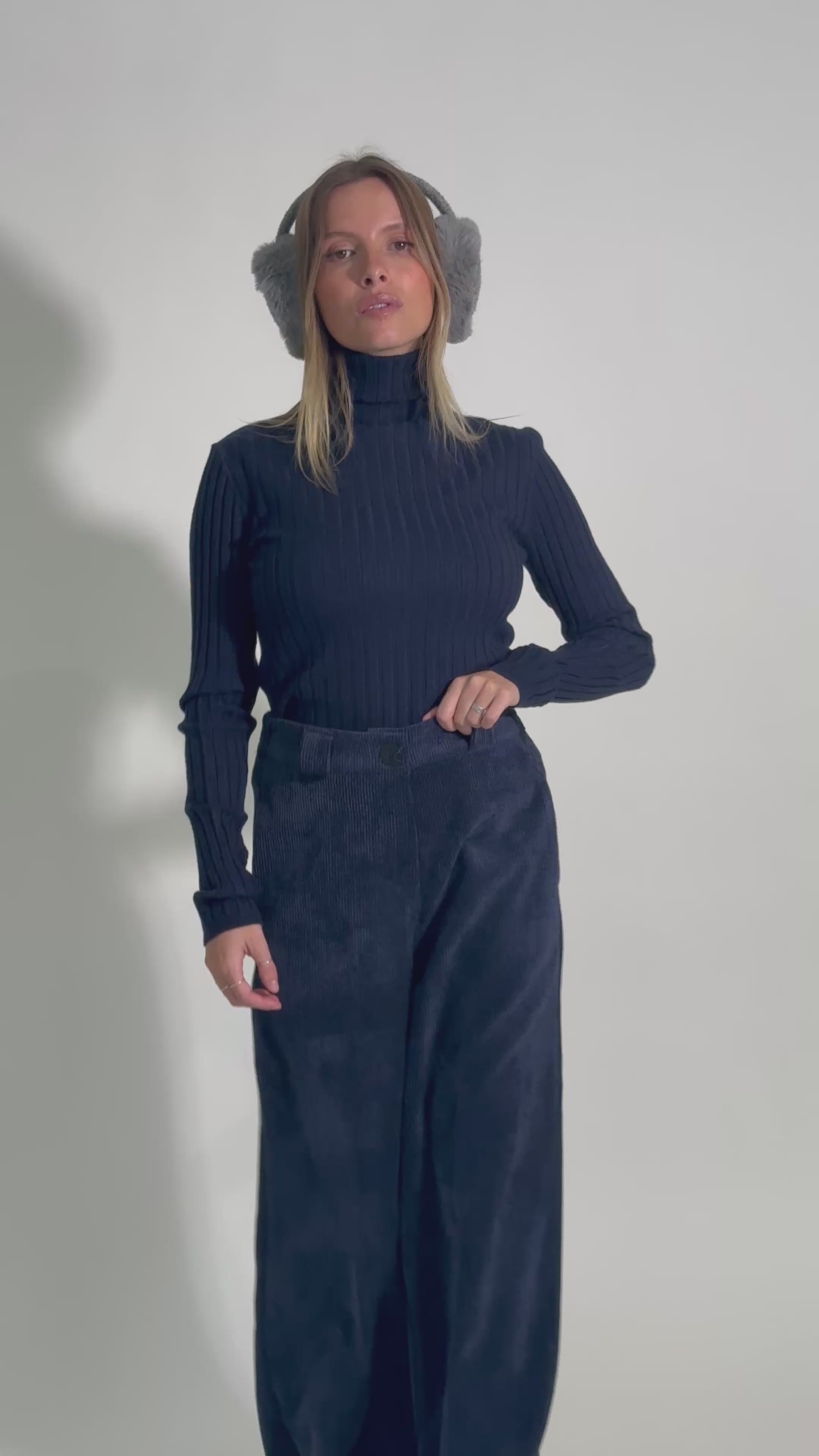 Pantalone a palazzo in velluto con vita elastica posteriore, vita medio alta e tasche laterali.