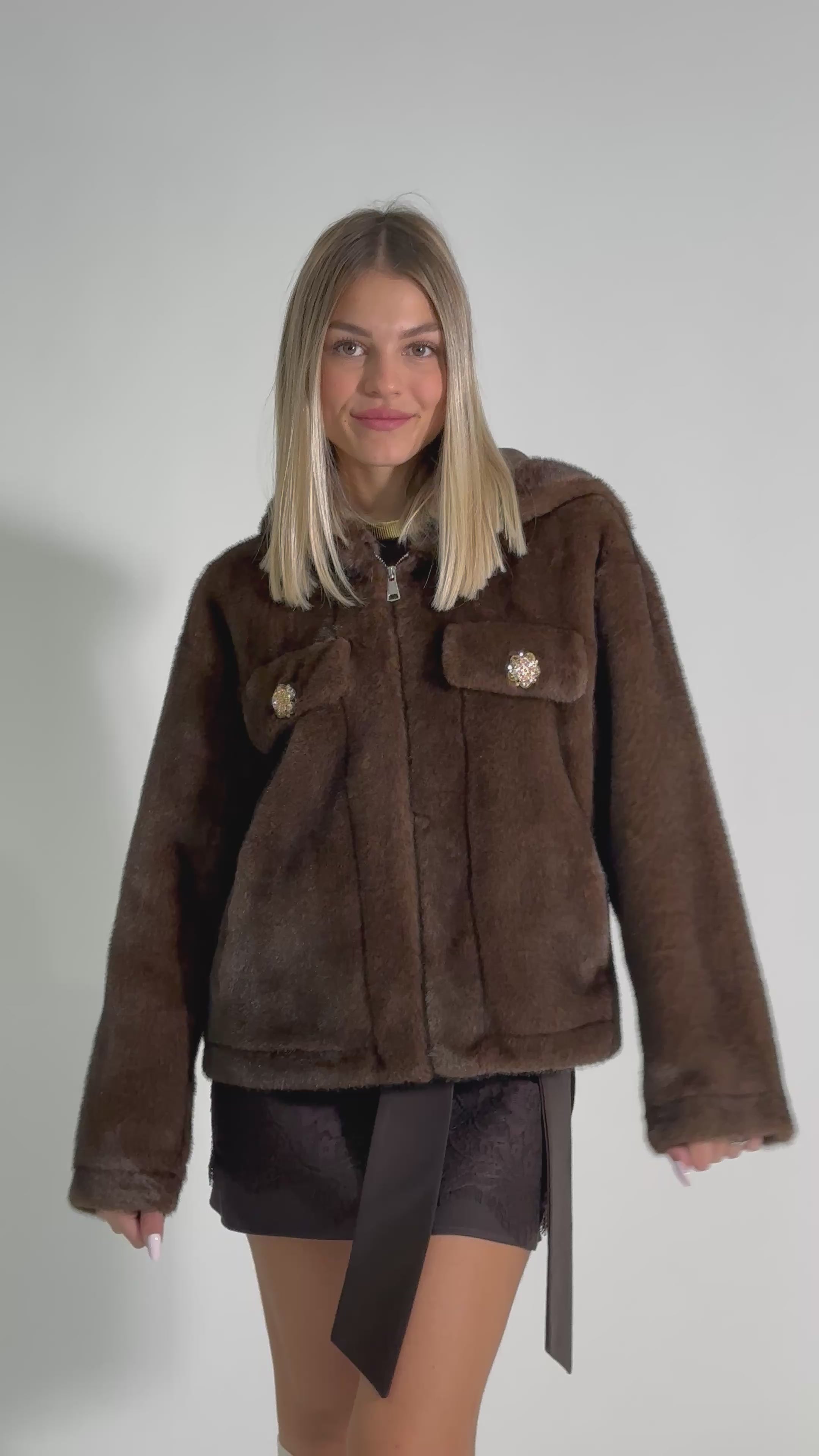 Eco pelliccia dal taglio dritto con cappuccio, chiusura a zip, tasche laterali e dettaglio bottoni gioiello.