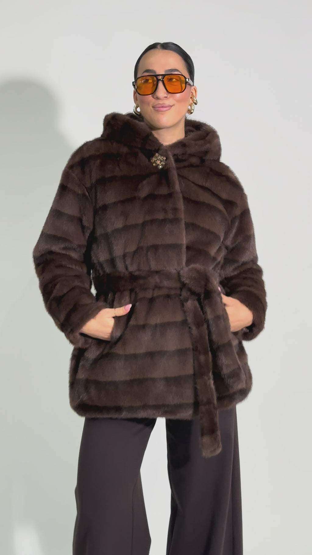 Eco pelliccia foderata con cappuccio chiusura bottone gioiello tasche laterali e fusciacca.