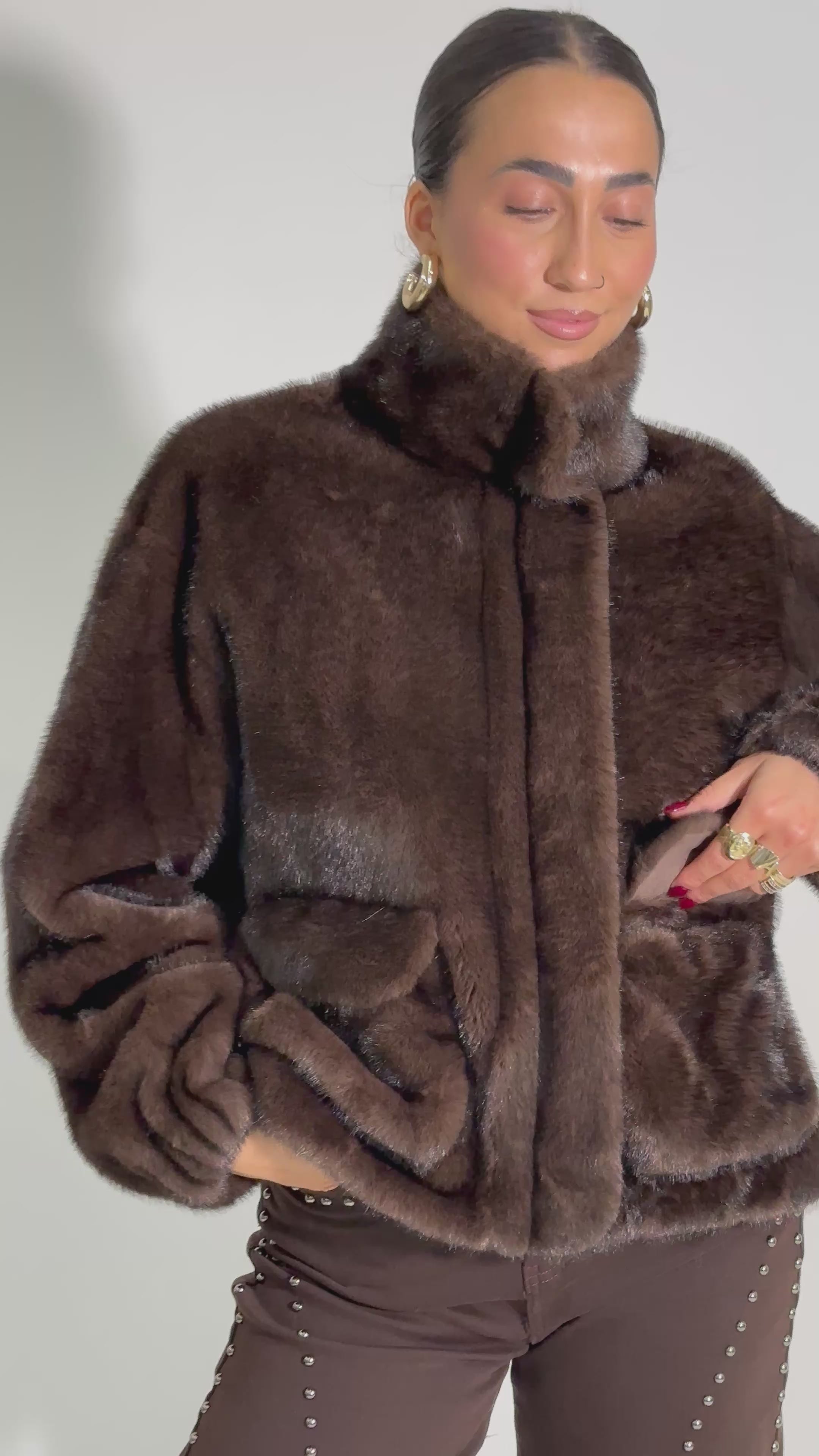 Eco pelliccia regolare con interno in eco renna, chiusura a zip e tasche a patta.