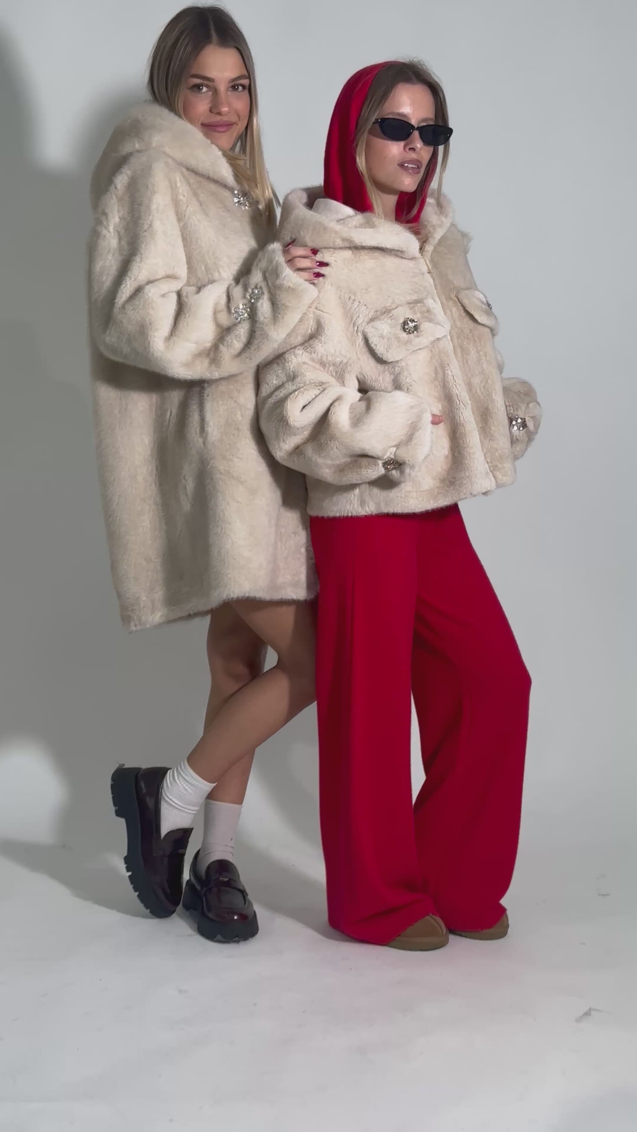 Eco pelliccia midi dal taglio over con cappuccio, chiusura a ganci, moschettone e bottoni a gioiello e tasche laterali.
