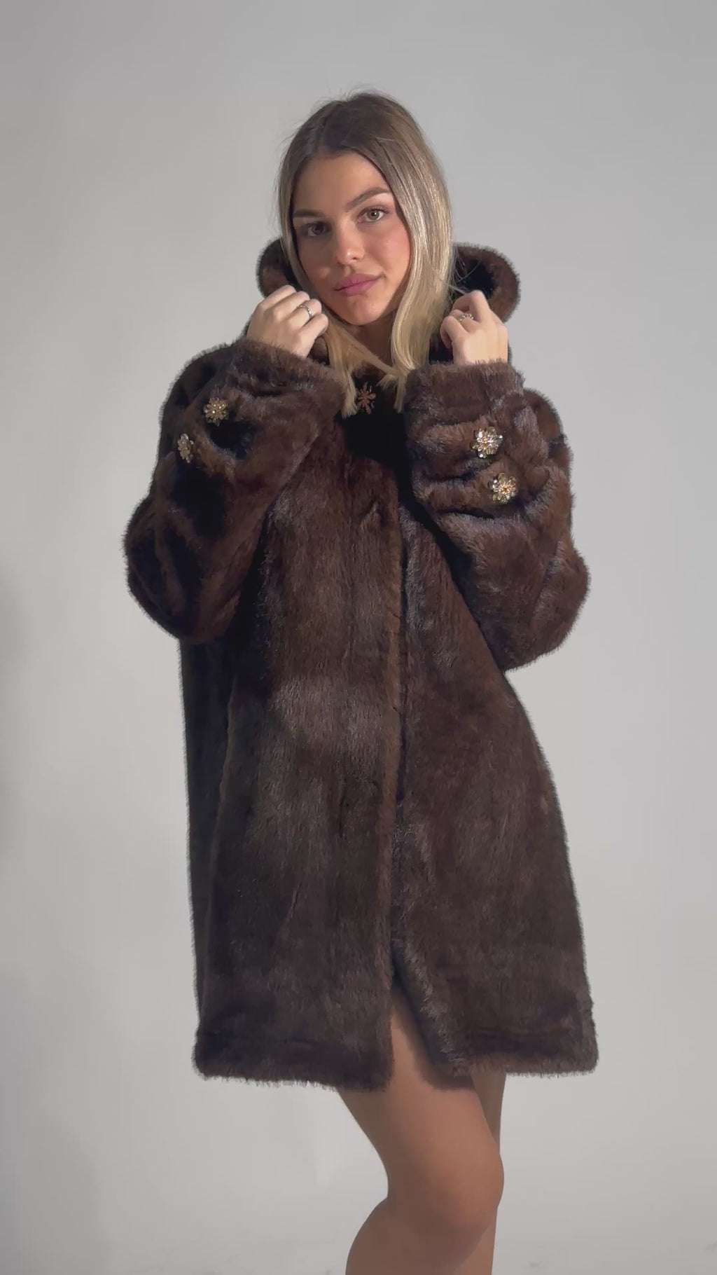 Eco pelliccia midi dal taglio over con cappuccio, chiusura a ganci, moschettone e bottoni a gioiello e tasche laterali.