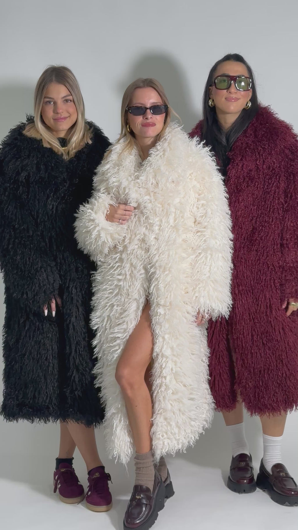 Eco pelliccia in mongolia foderata con collo reverse e chiusura a ganci.