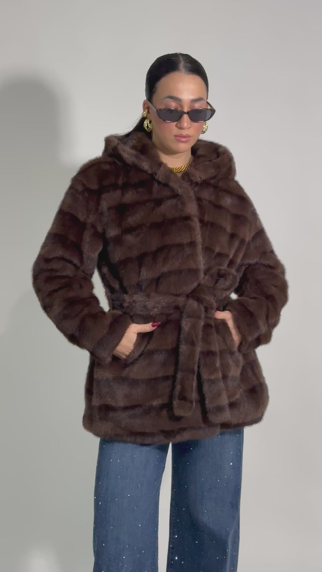 Eco pelliccia foderata con cappuccio chiusura bottone tasche laterali e fusciacca.