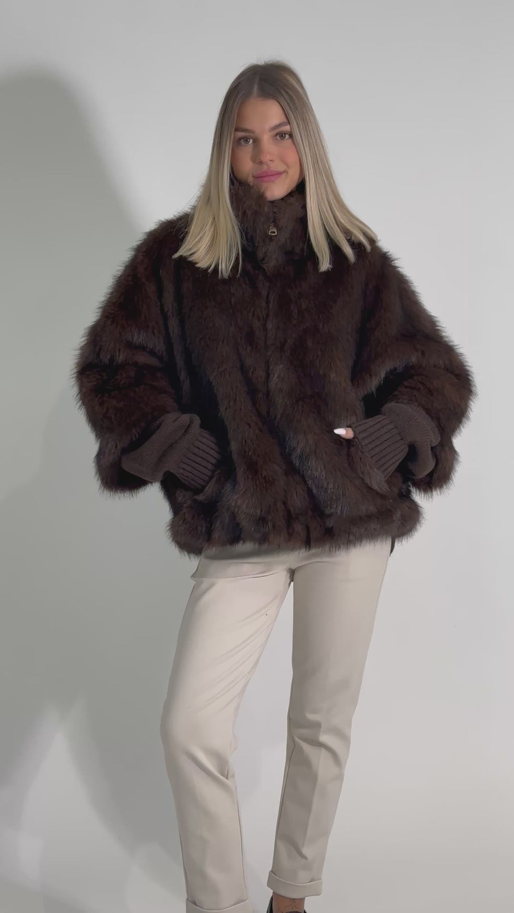 Eco pelliccia over con chiusura a zip, maniche a 3/4 e tasche laterali.