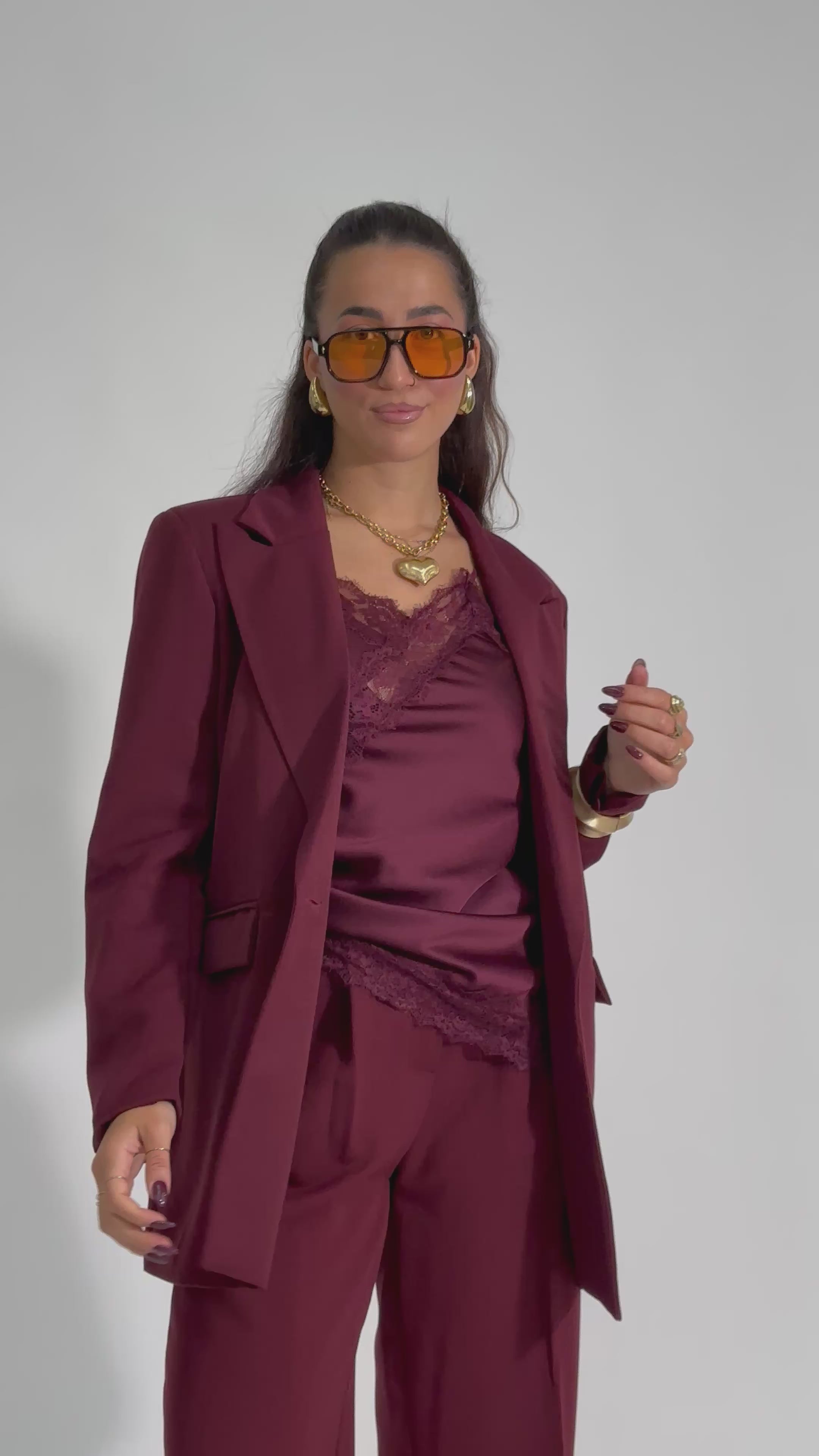 Pantalone a palazzo con pences, vita elastica posteriore e tasche laterali.