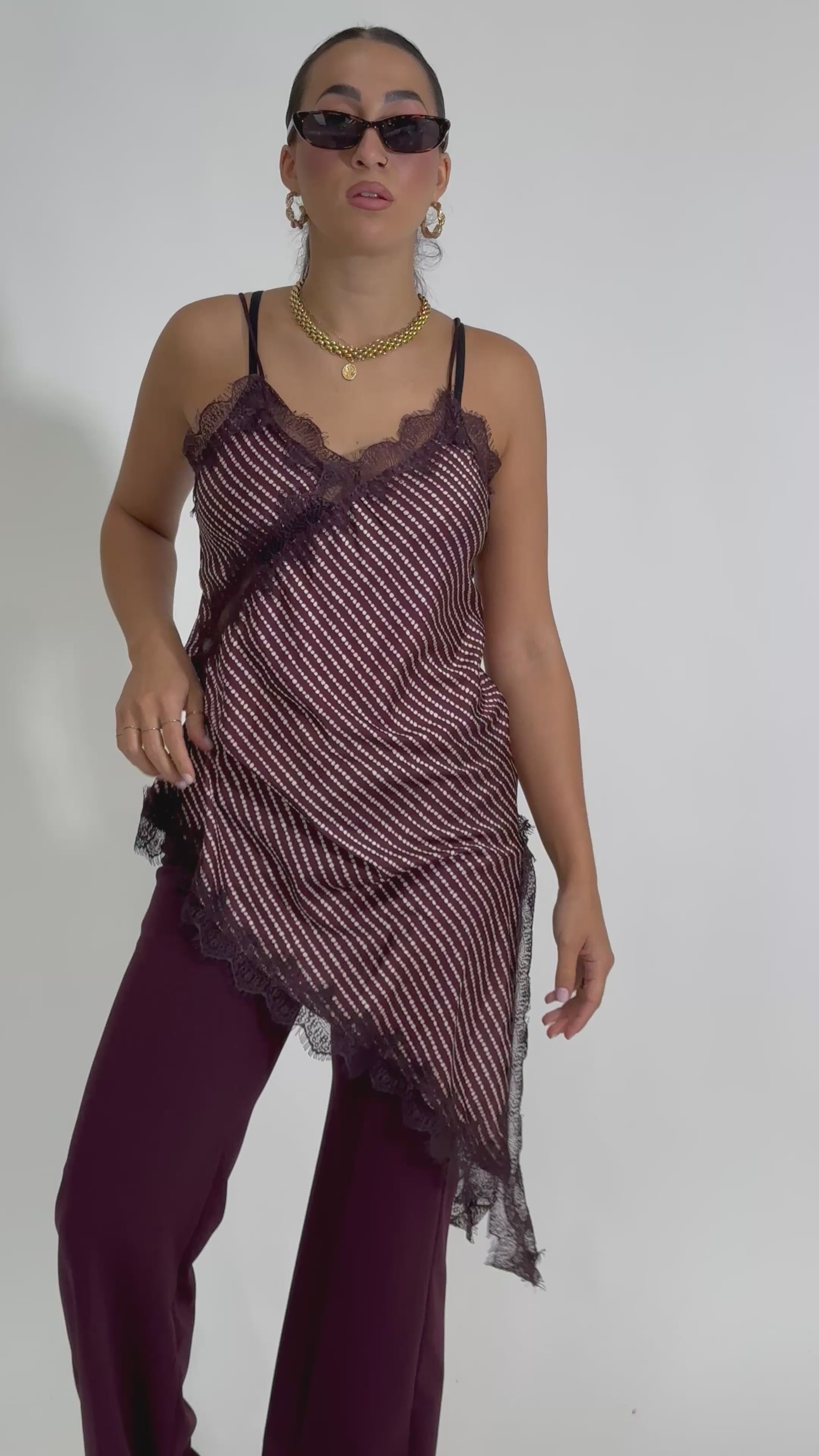 Top in satin con pizzo tagliato in sbieco a contrasto con spacco e spalline a coda.