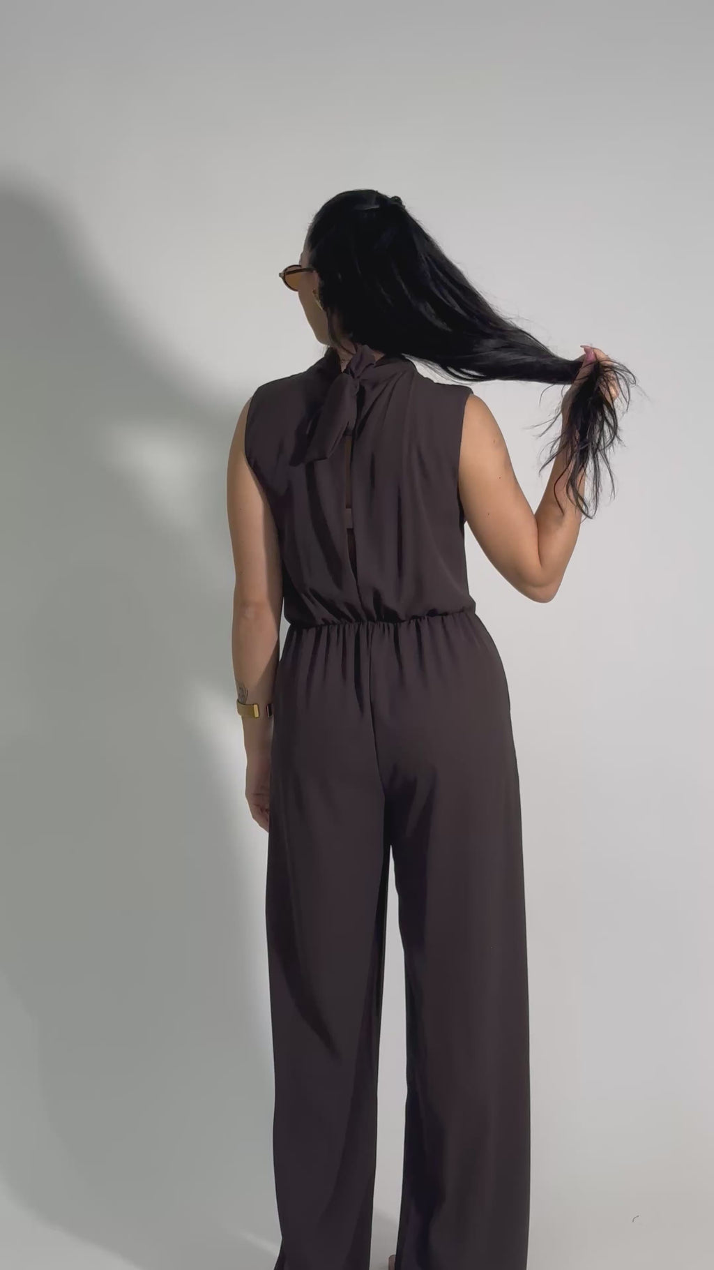 Tuta fluida smanicata con tasche laterali pantalone ampio a gamba dritta chiusura posteriore a fiocco che lascia intravedere la schiena. il collo davanti è caratterizzato da un raffinato collo con intreccio morbido.